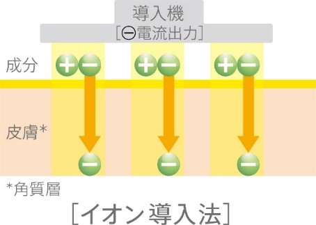 肌に欠かせない成分(ビタミンAやビタミンC)を超音波とイオン導入の2つの電気で補充し